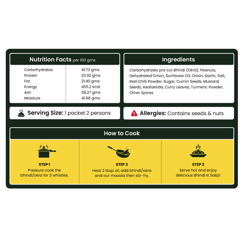 Crispy, tangy, and quick—this Jain Bhindi Meal Kit features hand-cut bhindi and a spice mix crafted without onion or garlic. Just open, cook, and serve.