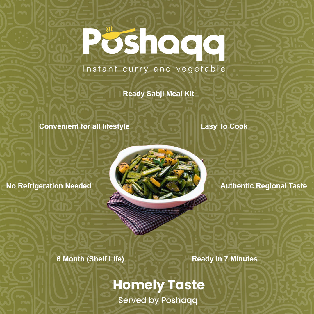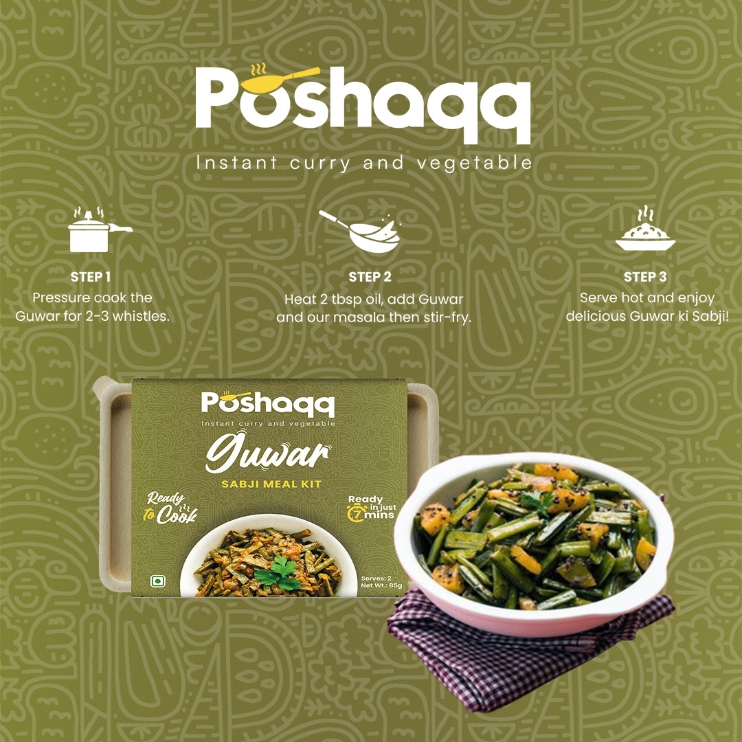 Poshaqq | Ready to Cook Guwar (Cluster Beans) | Gawar Meal Kit | Ready in 7 mins | No Preservatives | Sabji Mealkit | Perfect for Lunch, Dinner & Travel | 25 grams Gavar and 60 grams Masala (Pack of 1) | After Cooking 300GMS | 2 servings