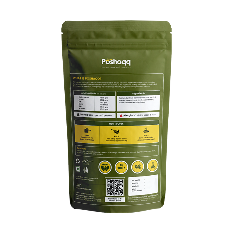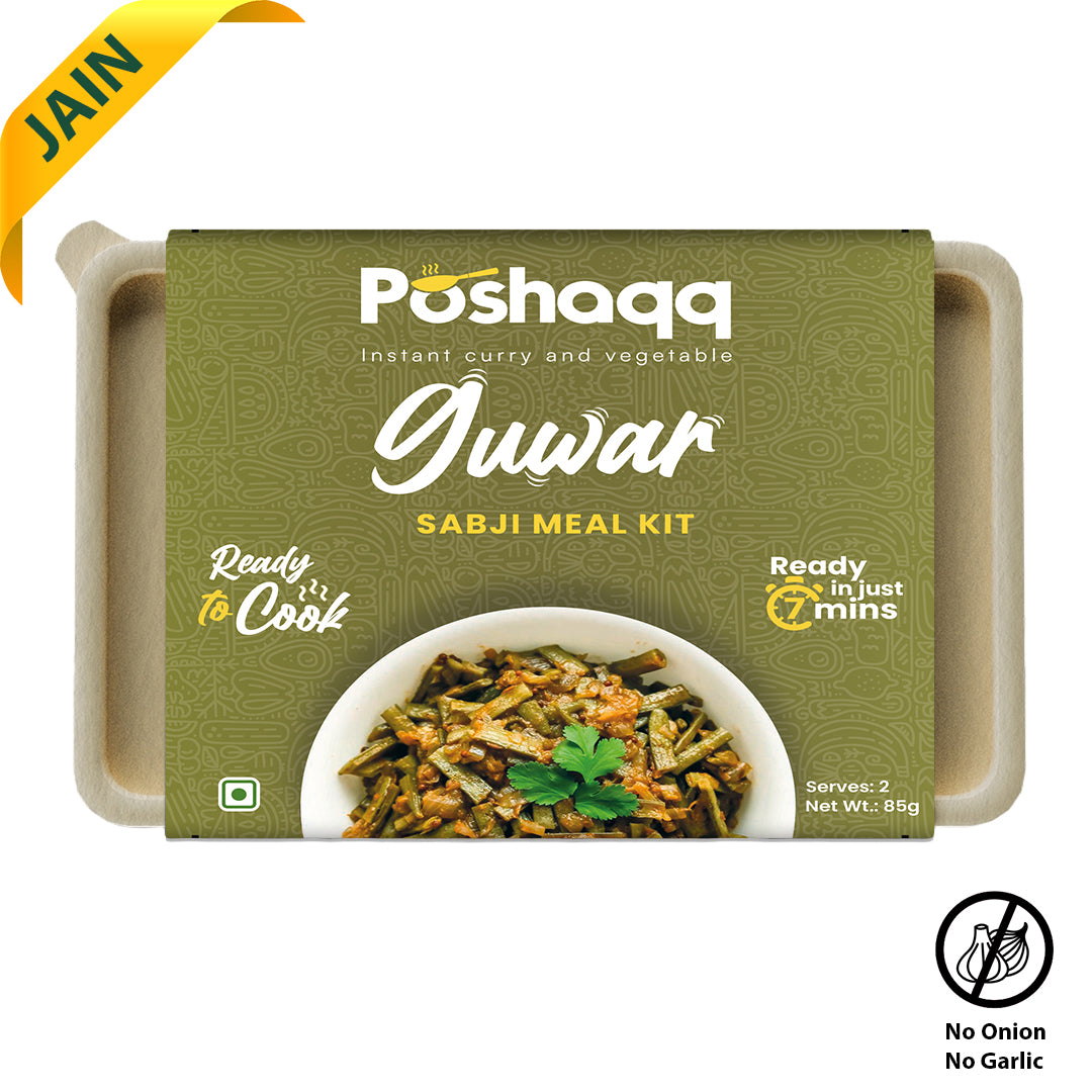 Poshaqq JAIN| Ready to Cook Guwar (Cluster Beans) | Gawar Meal Kit | Ready in 7 mins | No Preservatives | Sabji Mealkit | Perfect for Lunch, Dinner & Travel | 25 grams Gavar and 60 grams Masala (Pack of 1) | After Cooking 300GMS | 2 servings