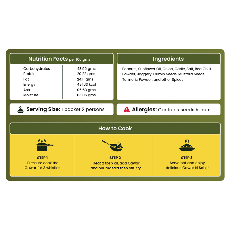 Savor the wholesome flavor of Guwar (cluster beans) in this Jain-approved meal kit. Comes with pre-cut guwar and mild, flavorful Jain spices.