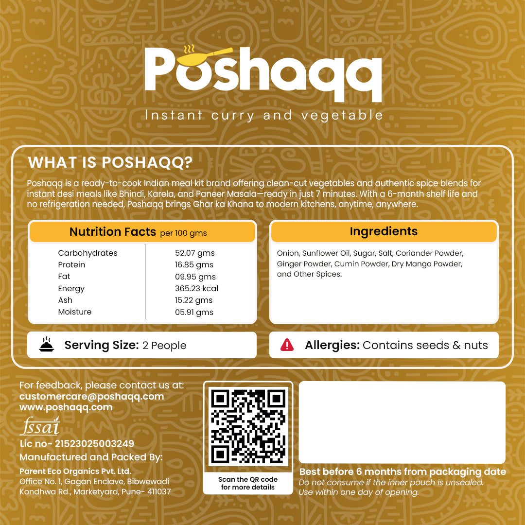 Enjoy the rich, earthy flavor of fresh fenugreek leaves with Poshaqq’s Ready-to-Cook Methi Sabji Meal Kit. Crafted with hygienically pre-cut methi and our chef-special masala blend, this easy-to-cook Indian dish delivers traditional taste in just 7 minutes. No chopping, no mess—just pure nutrition and convenience with a 6-month shelf life.