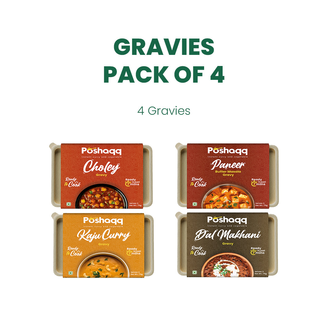 Enjoy North India’s most loved curries — without chopping onions, tomatoes, or spending hours in the kitchen. The Poshaqq Gravy Bundle brings you 4 gourmet-style gravies, made with hygienic, shelf-stable ingredients and chef-formulated spice blends.