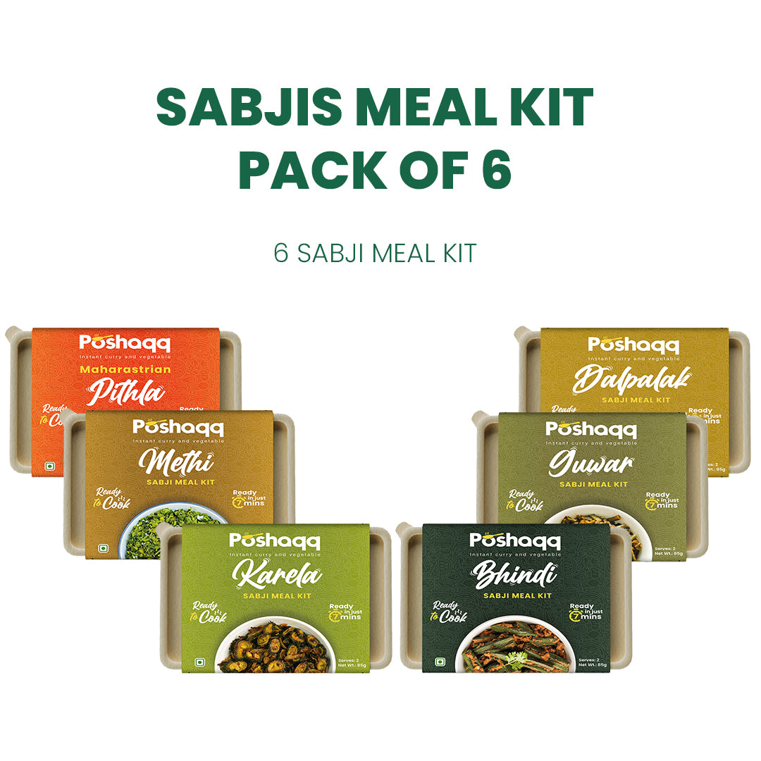 Bring home the goodness of home-style Indian vegetables — minus the chopping and prep. The Poshaqq Sabzi Meal Kit Bundle 6 authentic Indian sabzi kits, each made with pre-cut, hygienic vegetables and chef-designed spice mixes. Just open, cook, and serve in 7 minutes!