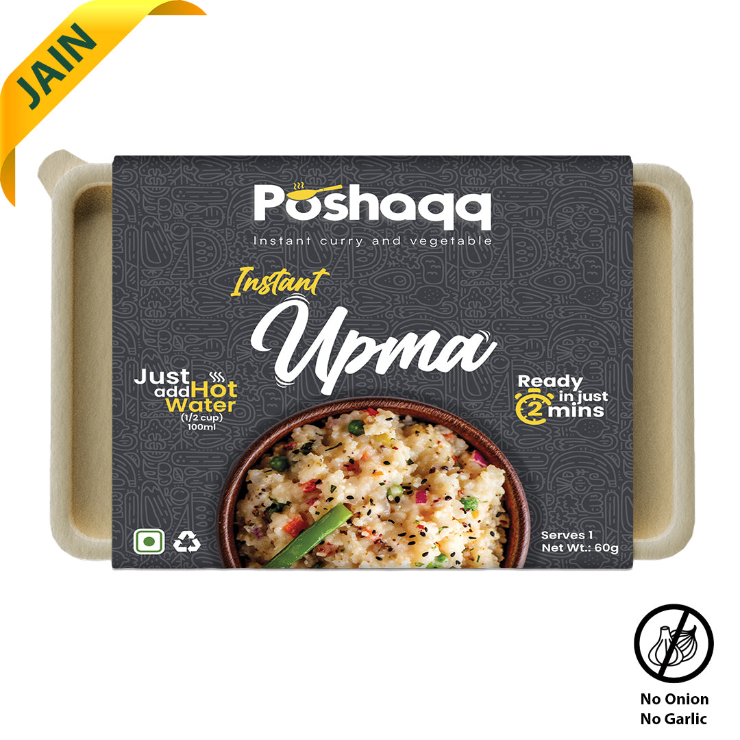 Poshaqq JAIN| Ready to Eat Upma – Instant South Indian Breakfast with Semolina (Rava), Veggies & Spices | Healthy, High-Fiber, No Preservatives | Quick Cooking, Travel-Friendly Indian Snack (60 (Gram) Pack of 1)