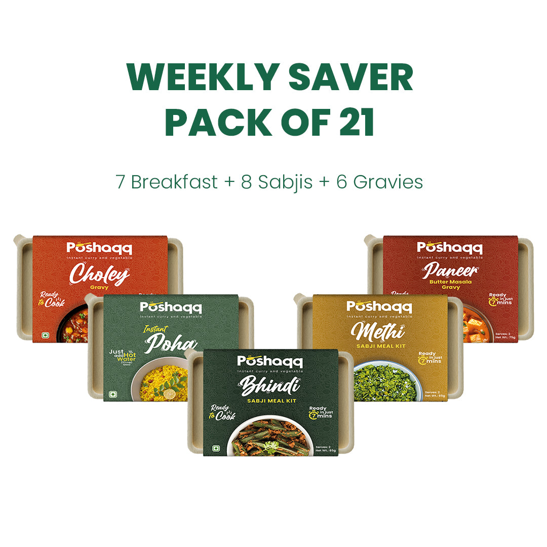 Say goodbye to grocery runs, chopping, and everyday meal stress with the Poshaqq Weekly Saver Kit — a complete 7-day plan with 21 chef-crafted, ready-to-cook Indian meals. Inside, you'll find a balanced mix of: